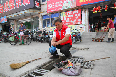 志愿者将下水井的遮挡栏杆打开取出里面的垃圾。