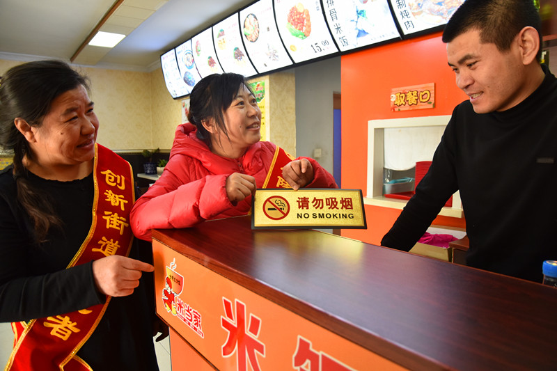志愿者劝导公共场所请勿吸烟。